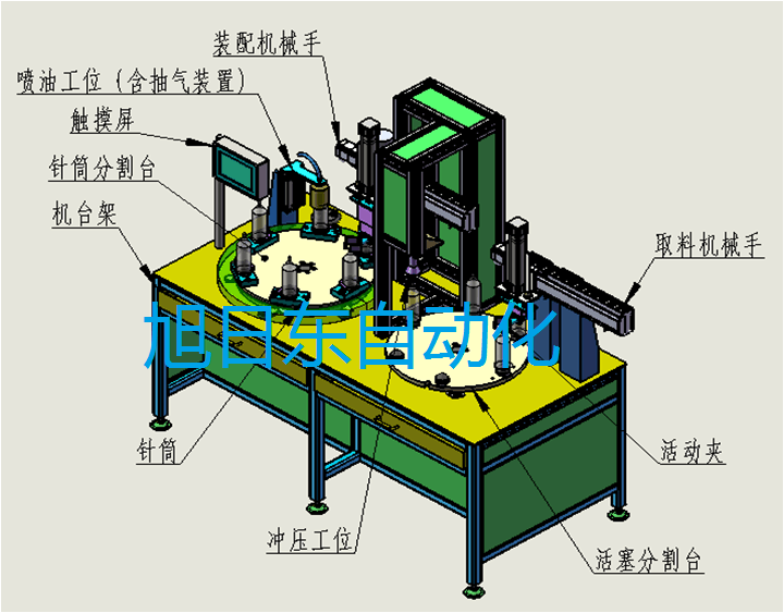 此方案采用了兩臺360°間歇分割器分別配送針筒及活塞到指定位置再機械手自動抓取裝配;途中實現自動夾定位,自動噴涂潤滑硅油,實現自動松開夾具等功能;裝配完成后采用了機械手自動下件功能。